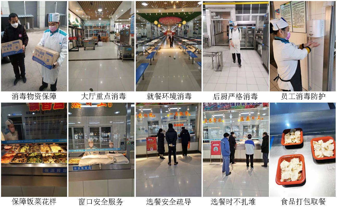 依令而行,重在行动,按照学校关于新冠肺炎疫情防控要求,加强工作的协调落实,并制定疫情防控应急处置措施。其一,开展餐厅疫情防控动员宣传和防疫知识培训,严格按照要求进行消毒。每日常规性就餐区域消毒3次,餐厅全面消毒2次,对餐厅各区域进行无死角地毯式消毒,筑牢每一道安全防线。其二,严格做好人员自身防护,在岗员工实行封闭式管理,全天候不外出,全日佩戴口罩,每餐段上岗前进行体温检测、口罩消毒和洗手程序。其三,配售区域与就餐区域有效分割,分区就餐,单人单桌、同一朝向,提供打包服务,尽量避免员工与就餐者之间、就餐者与就餐者之间近距离接触或交流。其四,保持就餐大厅和后厨操作间及库房每天至少通风3次,就餐期间保持空气流通清新。其五,严格餐饮具高温消毒程序,保证食品加工烧熟煮透,热菜热饭供应。其六,伙食保障科学化,克服采购困难,加大富含维生素的新鲜蔬菜的供给,稳定饭菜价格,保障每餐荤素营养搭配,为师生合理调整膳食结构,提高机体免疫功能所需。