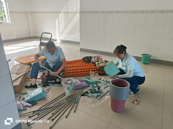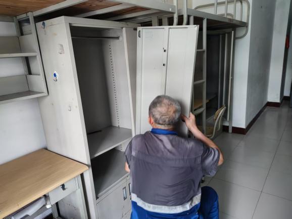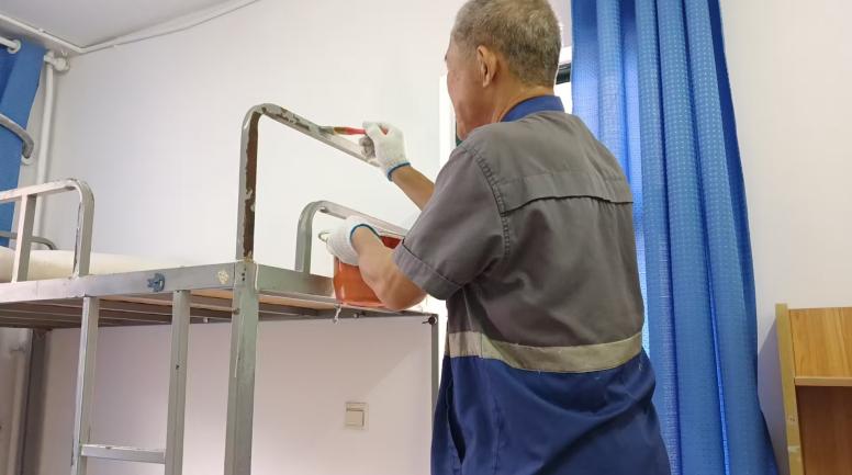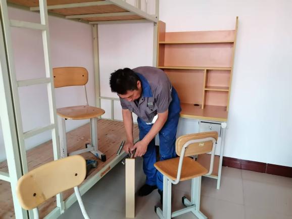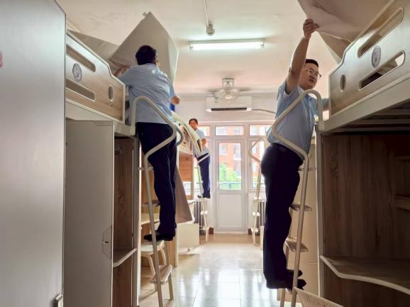 细致筹备,营造“拎包入住”宿舍。工作人员逐间排查宿舍设施,对桌椅、床铺、衣柜等家具进行全面检修加固;对门窗玻璃、卫生间等进行深度清洁、消毒,确保房间干净整洁、无异味;提供“一站式”床品铺设服务,利用暑期提前将学校统一采购的新生卧具搬运至各宿舍楼,逐一拆包、铺设整理到位;提前配置扫帚、垃圾桶等清洁用具到屋,确保新生“拎包入住”。