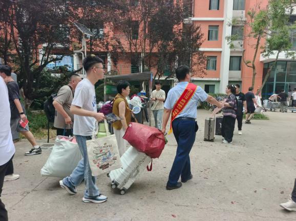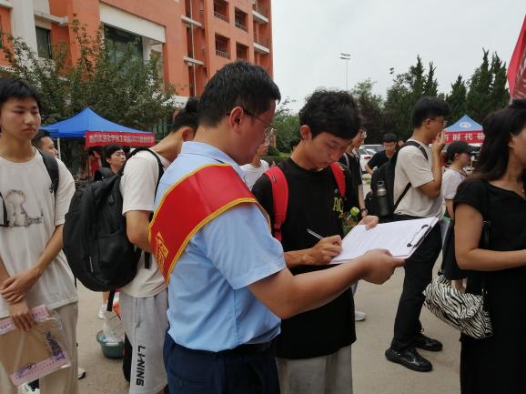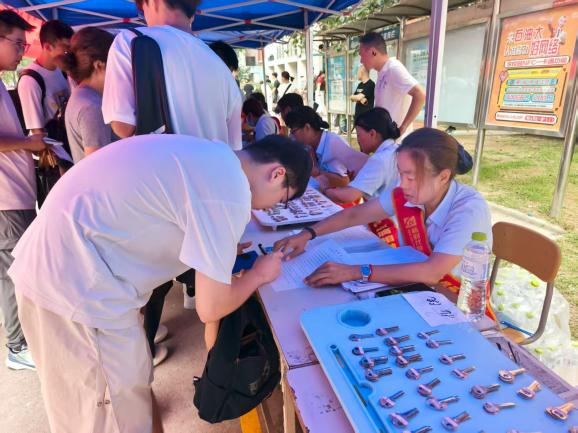 周到服务,设立便捷迎新站点。在校园新生报到点、各宿舍楼前设立多个“迎新服务站”。天气炎热,工作人员为到校新生及家长免费提供矿泉水5000余瓶、藿香正气水200余支,并配备应急小药箱;为新生指引道路,分发校园迎新地图3000余份。宿舍楼下,工作人员为新生办理入住登记手续、分发房间钥匙、解答各类咨询;雨水来袭,工作人员迅速反应,启动应急预案,灵活调整入住流程,确保新生及家长先入楼入住避雨,后补办入住手续。