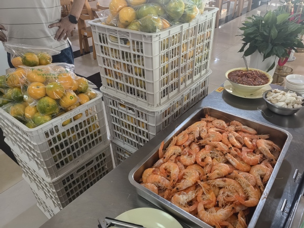 一大早,后厨师傅们便开始了忙碌的准备工作,为每位就餐的教师精心准备了一份“双倍惊喜”:6颗新上市的橘子和2只大个头的对虾。酸甜多汁的橘子象征着工作的“硕果累累、圆满顺遂”,肉嫩Q弹的大虾则传递着生活的“红红火火、如意吉祥”。这份精心搭配的礼物,让老师们在午餐中感受到节日的幸福感。