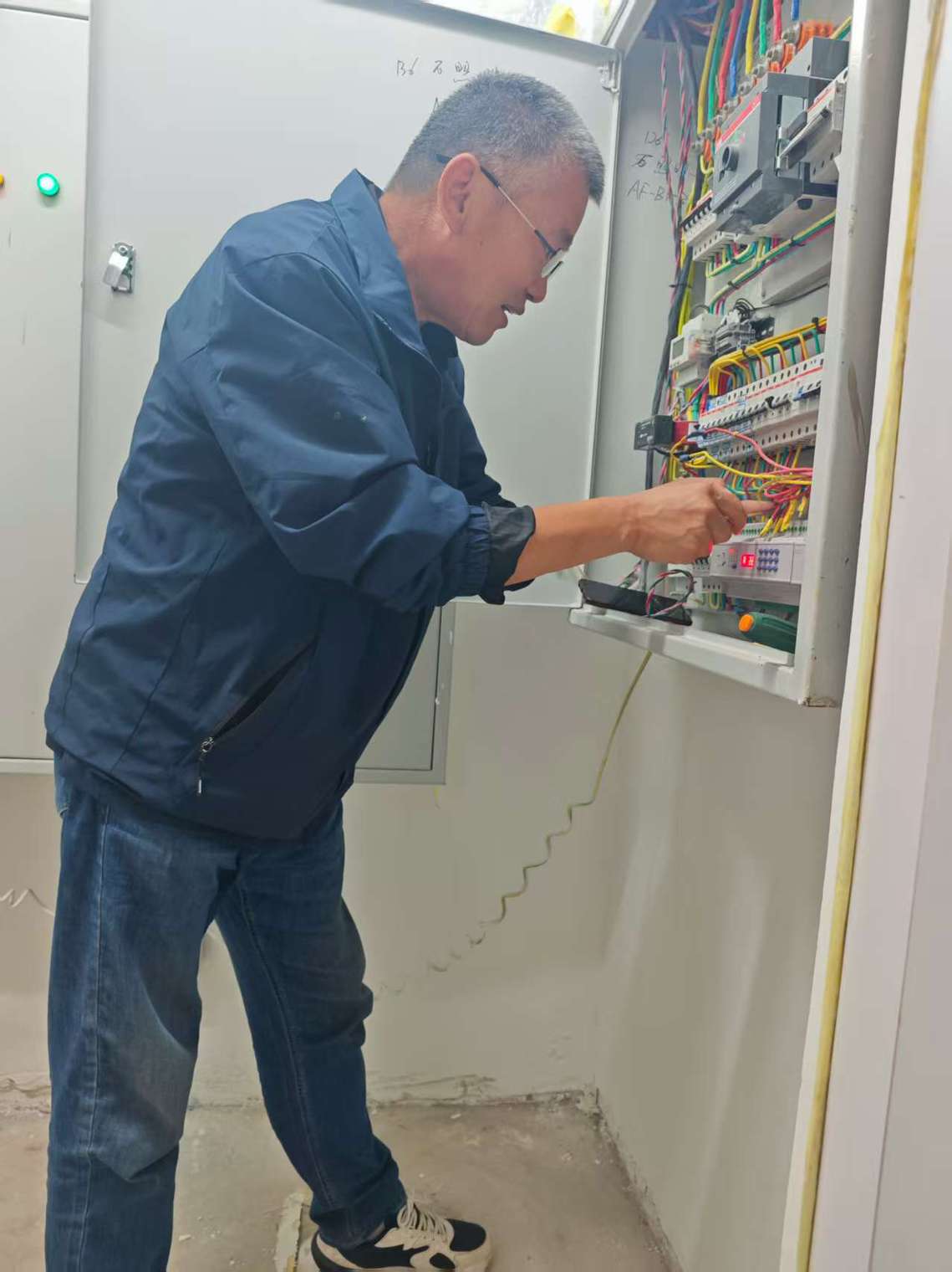 陈老师在古镇口校区维修智能照明控制模块