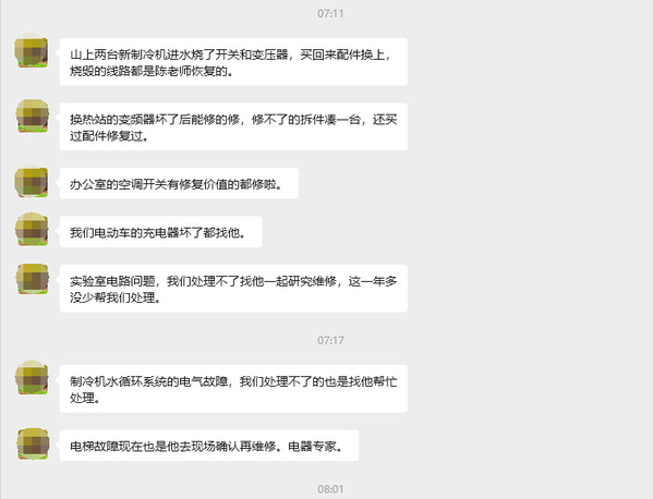 更令人钦佩的是,这些典型案例不过是陈老师维修履历的冰山一角。物业人员如数家珍:水泵变频器、电梯外呼板、空调开关、线路短路、变压器……种种技术难题在他手中皆能迎刃而解。但这位"维修达人"始终保持着低调作风,所有事迹都是通过同事或物业人员转述才被知晓。