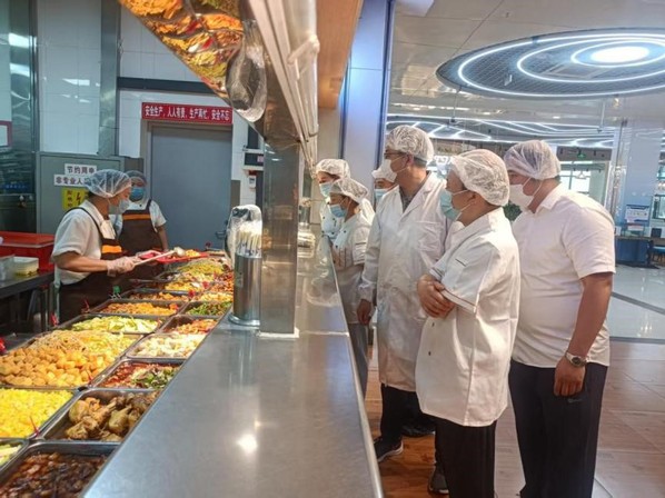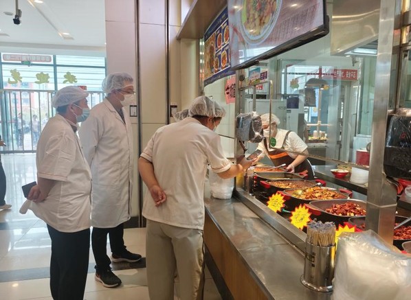 观摩人员实地考察了荟萃餐厅各售卖窗口的出品质量、售卖品种及饭菜价格,并深入原料库房、加工操作间、洗消间等关键区域。观摩人员围绕员工健康管理、食材采购储存、后厨加工、“三防”设施配备、餐饮用具清洗消毒及管理资料建档等核心环节,展开交流与探讨。