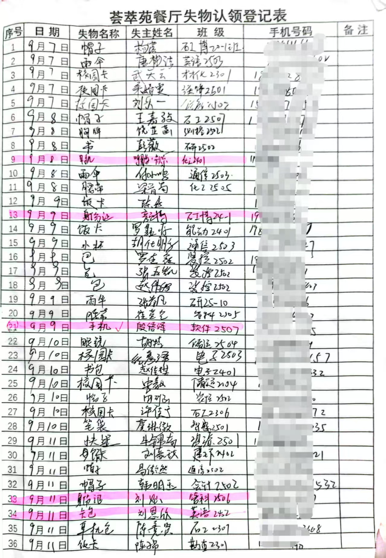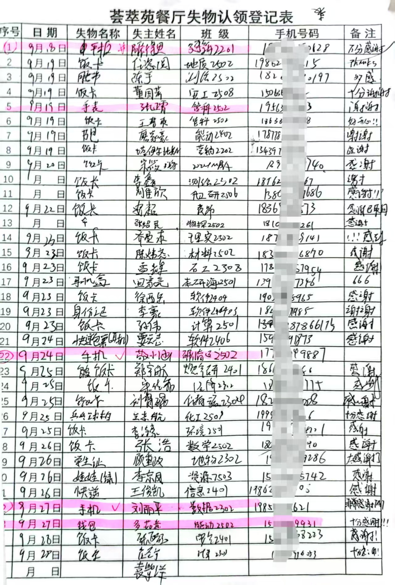 自秋季开学以来的一个月内,餐厅工作人员在日常清洁、窗口服务等工作中陆续捡到各类遗失物品,包括联想笔记本电脑1台、智能手机5部、身份证4张、校园一卡通上百张,以及书包、水杯、雨伞、衣物、U盘等若干件。每一件物品均被认真登记、分类保管,并第一时间启动寻主程序。一系列务实高效的举措,使得大量遗失物品得以迅速物归原主。不少同学在找回重要物品后纷纷表示感激:“没想到这么快就能找回来,真是太感谢了!”